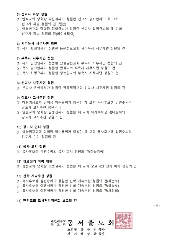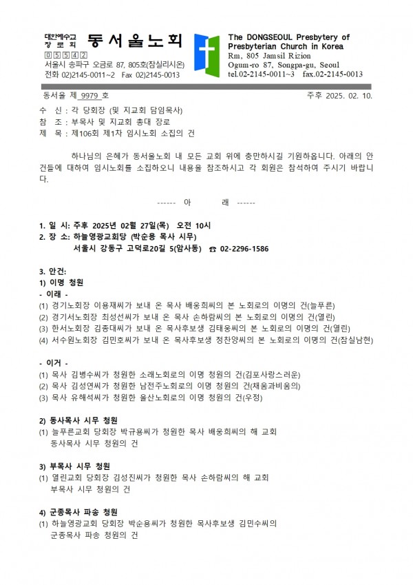 제106회 제1차 임시노회 소집 안내 페이지 정보 작성자 관리자 댓글 댓글 0건 조회Hit 372회 작성일Date 25-02-19 16:39 본문 제106회 제1차 임시노회 소집 안내 목록 이전글제107회 정기노회 소집 안내 25.02.26 다음글제106회 목사 임직식 및 강도사 인허식 안내 24.10.08