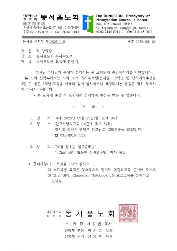 2025년 동서울노회 목사후보생 교육 안내
