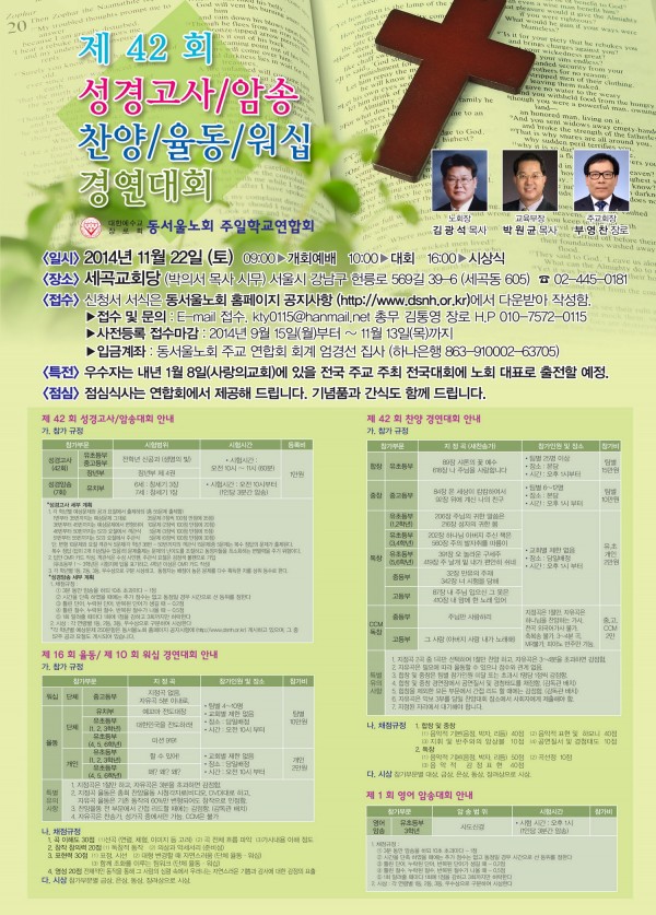 * 제 42 회 성경고사, 찬율대회 포스터 입니다 * 페이지 정보 작성자 김통영 댓글 댓글 0건 조회Hit 1,520회 작성일Date 14-09-25 21:01 본문 * 제 42 회 성경고사, 찬율대회 포스터 입니다 * 목록 이전글2014년 성경고사 요절입니다. 14.10.11 다음글2014년 영어 암송 사도신경 원문입니다. 14.09.25