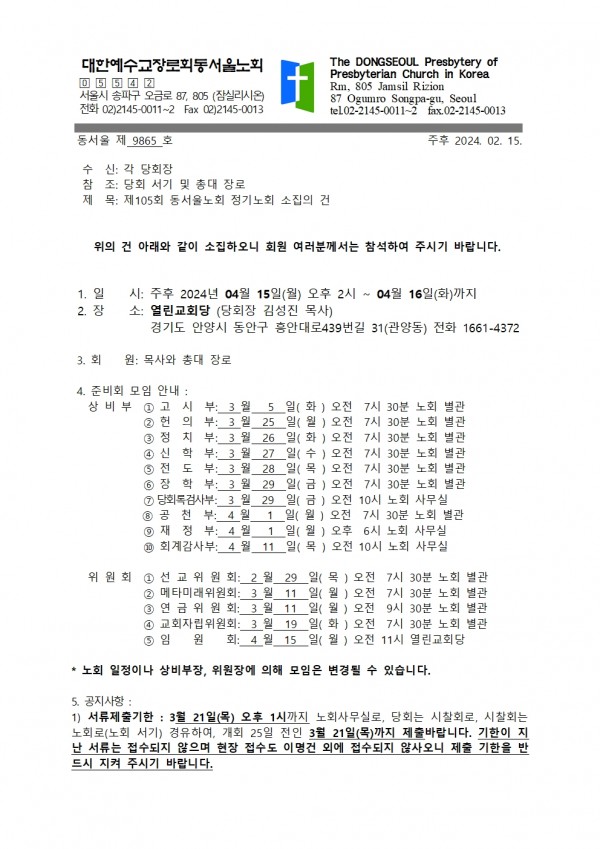 제105회 정기노회 소집 안내 페이지 정보 작성자 관리자 댓글 댓글 0건 조회Hit 1,048회 작성일Date 24-02-15 13:15 본문 제105회 정기노회 소집 안내 입니다 목록 이전글2024년 동서울노회 교육부 수양회 안내 24.05.24 다음글2023년 동서울노회 목사후보생 교육 안내 23.10.17